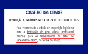Notícias Resoluções do ConCidades marcam avanço histórico para criação do Piso Salarial Nacional do Saneamento Leia Mais » 4 de dezembro de 2025