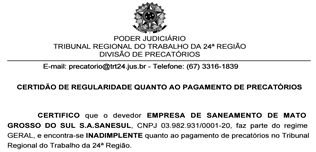 Enquanto contrata milhões em empréstimos a estatal SANESUL se encontra INADIMPLENTE junto a Tribunal regional do Trabalho 24ª Região.